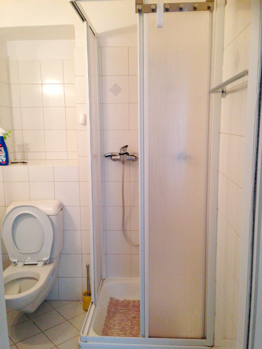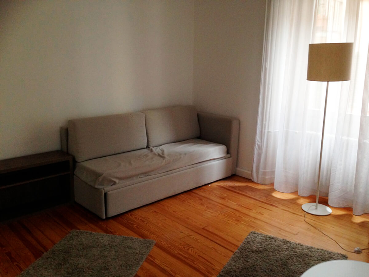 Monolocale arredato comodo al centro: divano letto, piccolo armadio, comoda cucina, bagno con doccia.