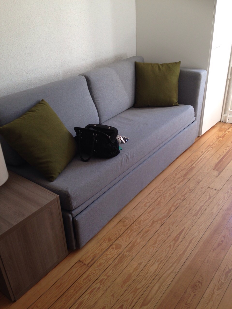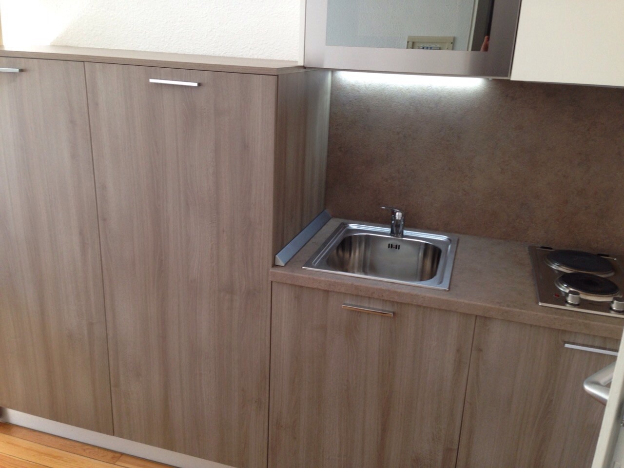 Monolocale arredato comodo al centro: divano letto, piccolo armadio, comoda cucina, ampio bagno con doccia.
